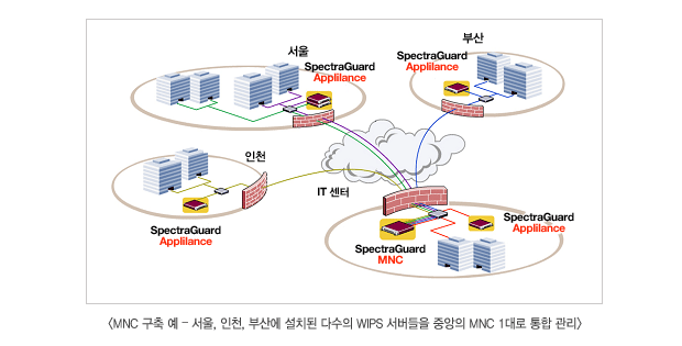 SpectraGuard MNC는 물리적으로 서로 다른 곳에 설치된 다수의 SGE WIPS서버를 한 개의 중앙 서버에서 통합관리하기 위한 다수의 서버 중앙 관제 기능(manager of manager)을 제공하며 본사의 보안 관리자가 SpectraGuard MNC를 통하여 국내의 지점 혹은 전세계의 주요 도시의 지사에 설치한 개별 SGE 서버, 센서, 수백만 개의 무선랜 디바이스들의 상황을 중앙에서 모니터링 및 모두 관리할 수 있게 하여 줍니다.